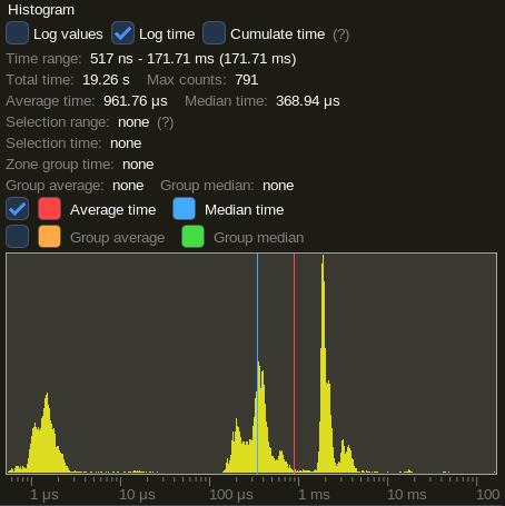 To check how much slowdown is introduced by using Tracy, I have profiled etcpak, which is the fastest ETC texture compression utility there is. I used an 8192×8192 test image as input data and instrumented everything down to the 4×4 pixel block compression function (that's 4 million blocks to compress). It should be noted that Tracy needs to calibrate its internal timers at each run. This introduces a delay of 115 ms (on my machine), which is negligible when doing lengthy profiling runs, but it skews the results of etcpak timing. The following times have this delay subtracted, to give focus on zone collection impact, which is the thing that really matters here.
