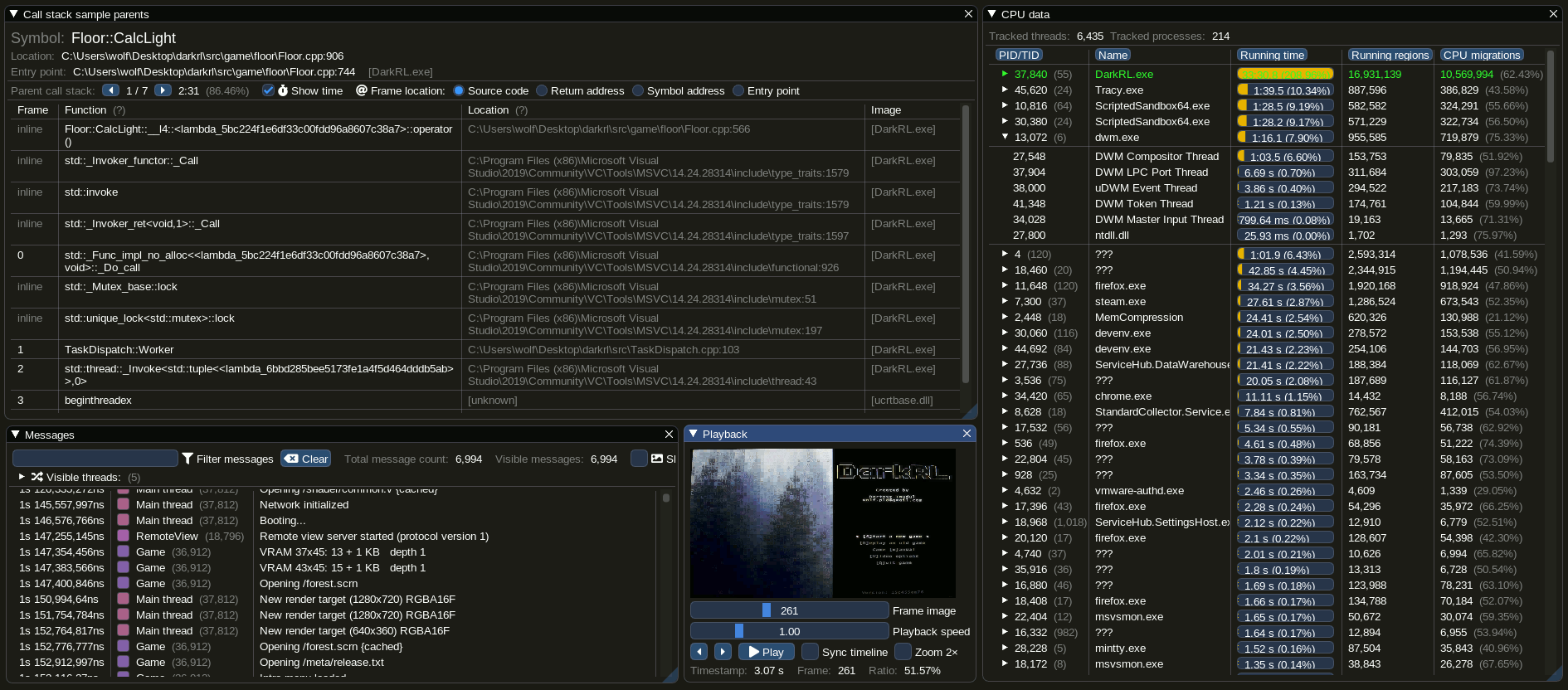 A real time, nanosecond resolution, remote telemetry, hybrid frame and sampling profiler for games and other applications.